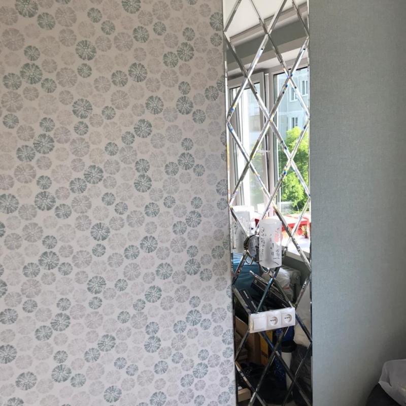 Использована квадратная серебристая зеркальная плитка размером 18х18.